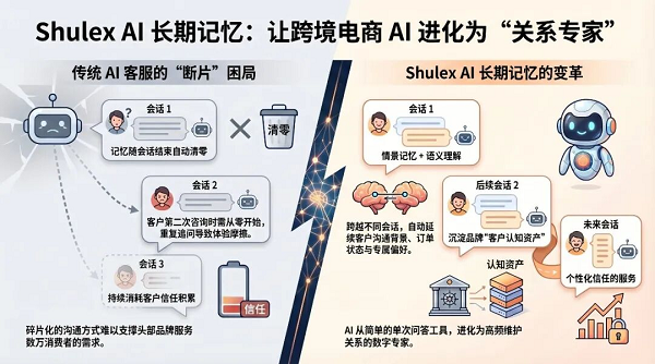 这是跨境行业首个“将跨对话持久记忆落地生效”的企业级AI客服解决方案,更是Shulex坚持“交付效果、量化收益”全职雇佣模式的再次迭代——让AI客服真正“记住”客户,能落地、真有效。
