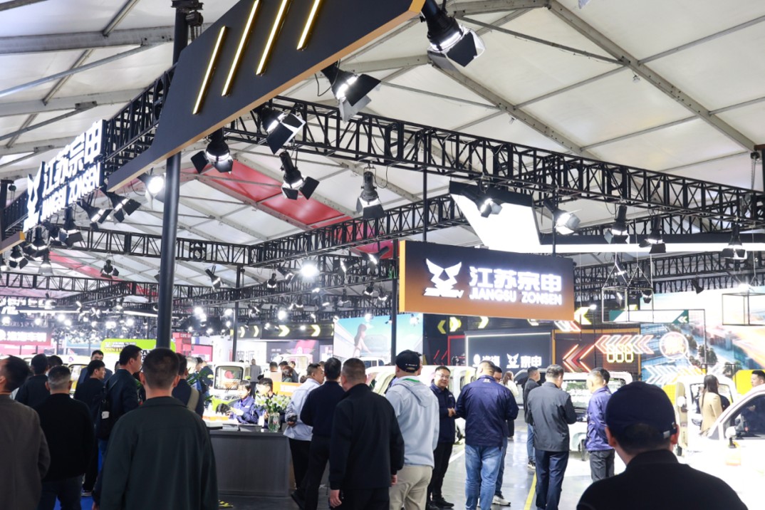 据介绍,江苏宗申超1700平方米的特大展馆整体采用黑黄机车风格装修,80余台展车整齐陈列,涵盖货运三轮、休闲三轮、客车、高端电摩等全品类产品矩阵。江苏宗申展位在本届丰县展中规模较大、格调突出,展现了龙头品牌的综合实力。