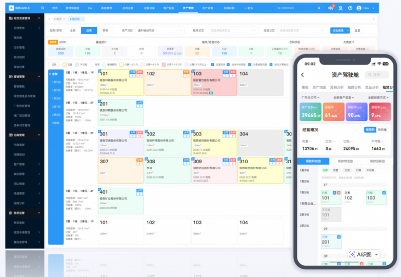 面向招商、租赁、资管、决策多层级岗位,打造专属房态图、合同智能洽谈、租赁智能风控三大核心能力,以数据视图替代复杂报表,以智能核算提升招商效率,以四道风控防线规避经营风险,助力物企全面释放资产增值潜力。