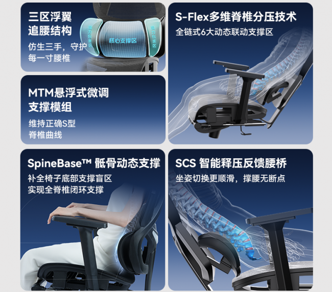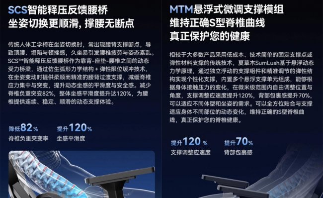 夏草木Fit2通过MTM悬浮微调模组+六区动态分压系统+SCS智能腰桥,实现坐、靠、动全过程“微米级智能响应”,坐姿切换无断点,真正做到“全自动匹配人体脊椎曲线”。