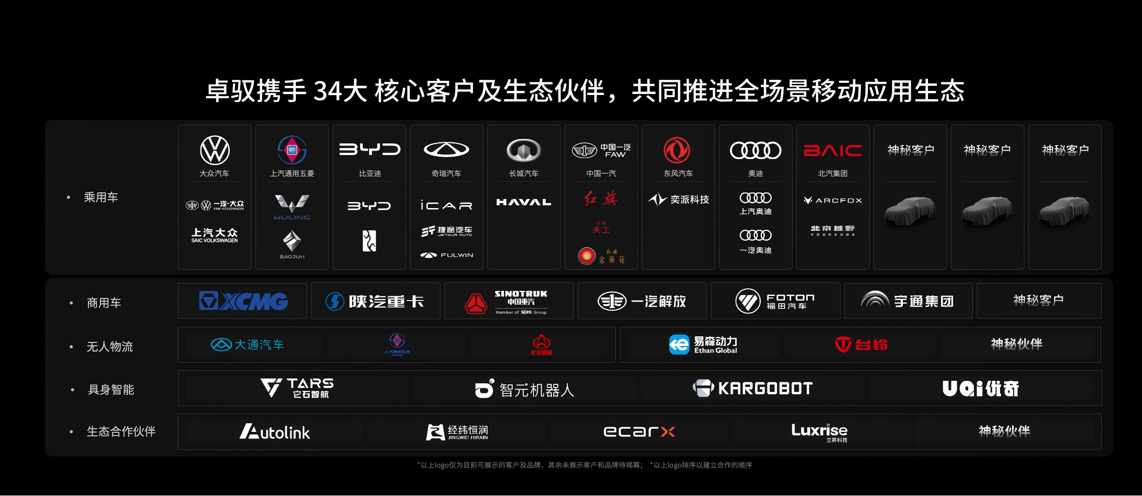 截至目前,卓驭已携手34家客户,合作车型突破130款,成为智能出行领域首个实现多垂类、多场景、多客户、大规模落地的科技公司。