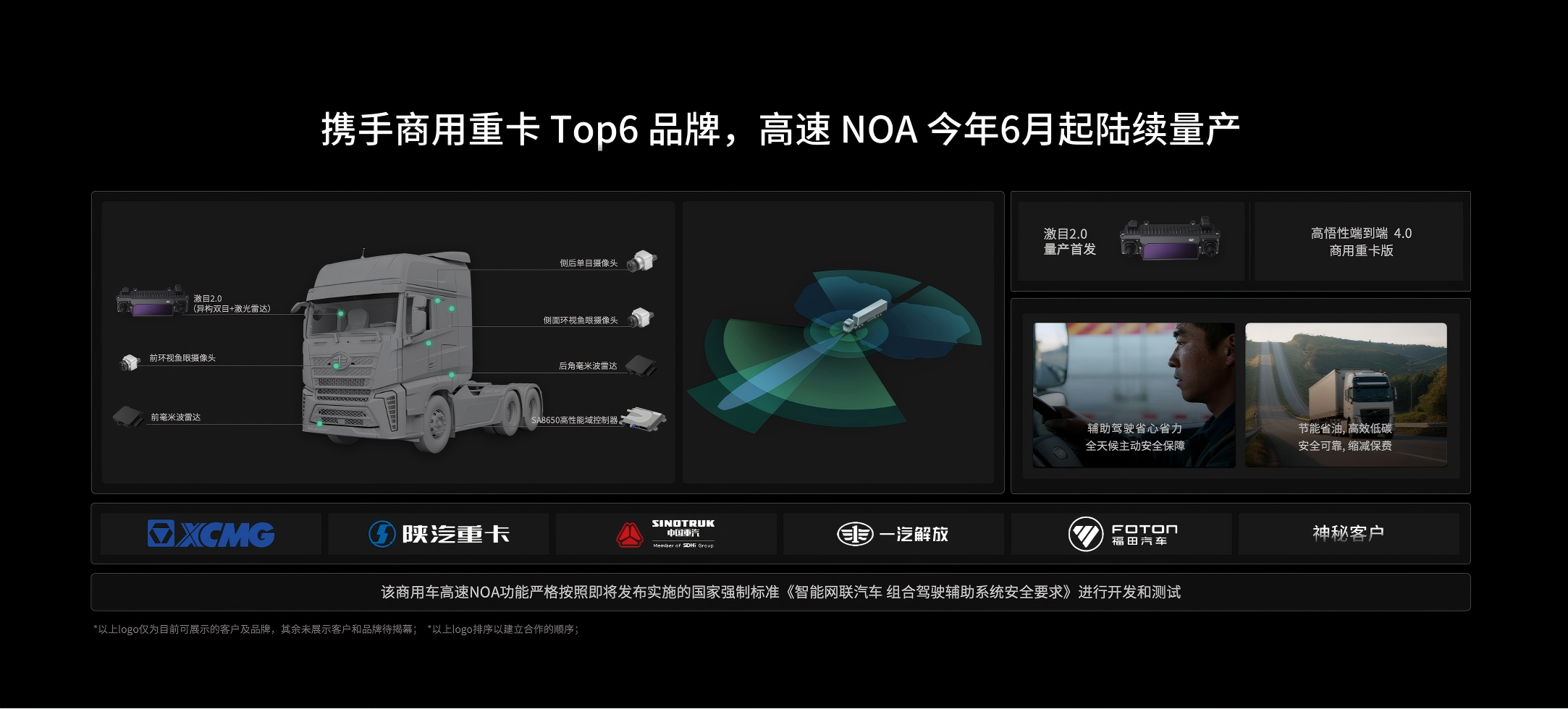 商用车方面,卓驭与中国重汽、一汽解放、陕汽、东风等TOP6重卡品牌全部建立合作。独创的激目2.0舱内激光视觉融合系统,配合原生多模态模型,使重卡NOA在安全性和燃油经济性上均取得突破。搭载该方案的车型将于今年6月起陆续量产交付。此外,卓驭与宇通客车合作的NOA方案将于9月量产,覆盖高速、城区及自主泊车。