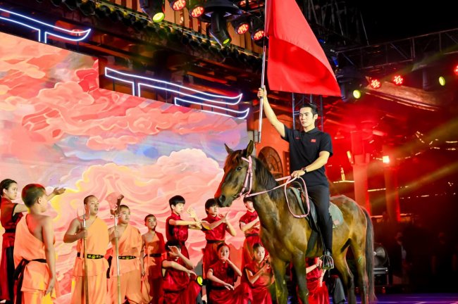 最令人瞩目的,莫过于当晚的2026泉州时尚周暨鸿星尔克新锐运动发布会的登场时刻。于适身着新锐运动装备,在复刻的经典骑马名场面中策马直入威远楼活动主会场。他手持旗帜,自信昂扬的飒爽风姿与品牌积极向上的运动精神完美契合,瞬间引爆现场氛围,在万人应援的声浪中,传统与潮流在此实现了一场跨越时空的共振。