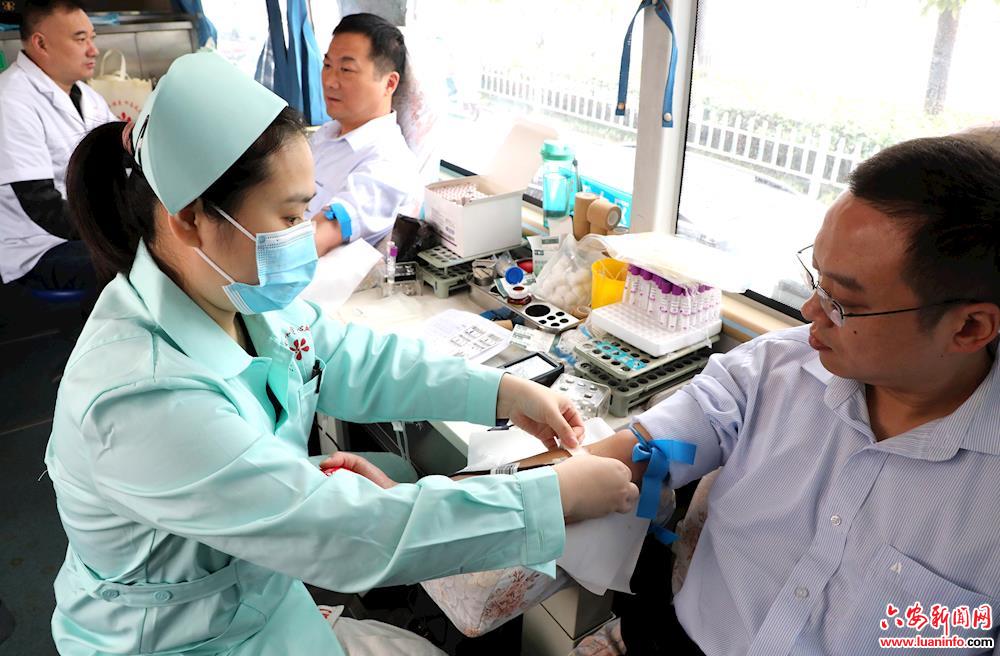 本网讯 9月23日,市中心血站流动采血车来到六安农商银行、高速财富广场开展无偿献血活动。