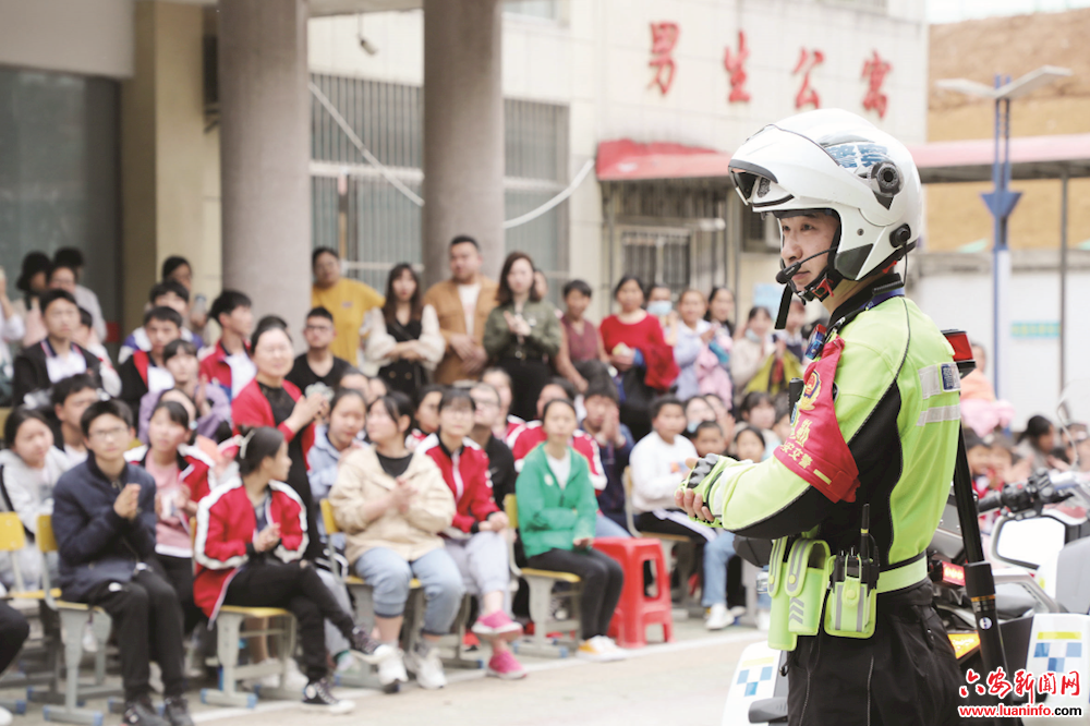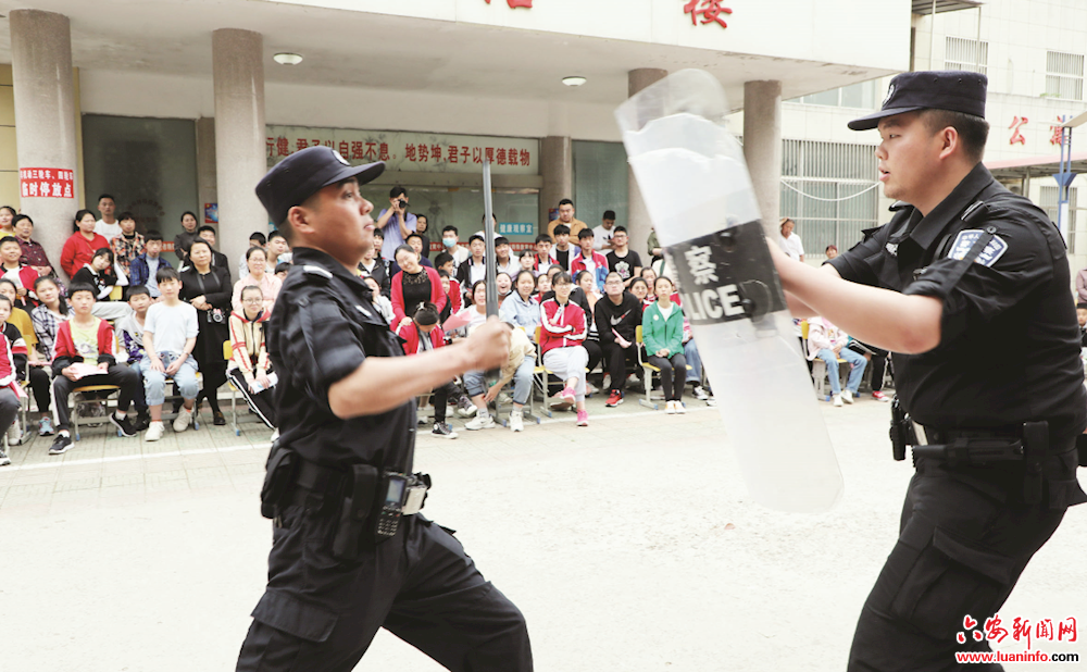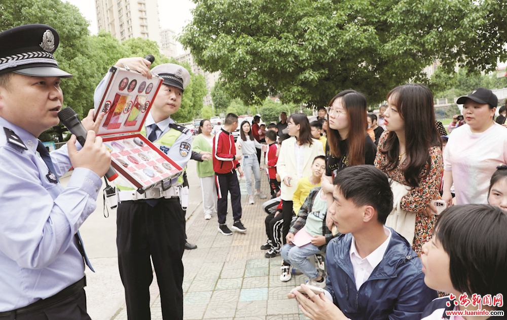 活动中,交警大队民警详细介绍了安全头盔和安全带的重要性以及日常出行的注意事项,特警二大队民警向学生展示了警用装备的使用。刑侦大队民警则讲解了防范电信诈骗、防范应对暴恐袭击基本常识及预防校园欺凌等相关法律知识。禁毒大队民警运用通俗易懂的语言,结合鲜活的案例,采取以案讲法,以案学法的方式,为全校师生上了一堂“远离毒品、珍爱生命”的安全课。( 皖西日报融媒体记者 王丽 摄)