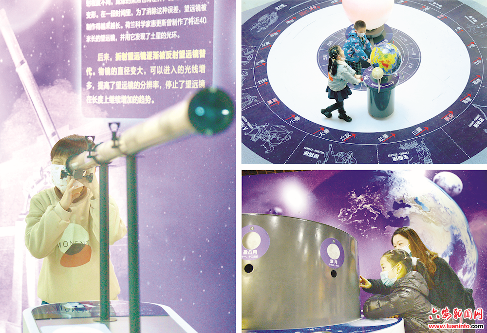 近日,市科技馆推出由“遥望深空”“漫游太阳系”和“巧量天宇”等主题组成的天文科普展,30余件展品通过图文并茂、多媒体展示、趣味互动体验等多种方式,向市民展示日月同辉、月相变化、天文学家故事等前沿天文科普知识和信息,大家通过解说介绍、展品互动体验进一步了解宇宙、了解太阳系、了解地球,感受天文科学魅力,放飞探索宇宙奥秘的梦想,尽享一场星空世界的科普大餐。右上图:小朋友在体验“推动地球 走过四季”展品,观察一年四季斗转星移的奥秘。右下图:小朋友和家长通过展品观察月相变化。(皖西日报融媒体记者 田凯平 摄)