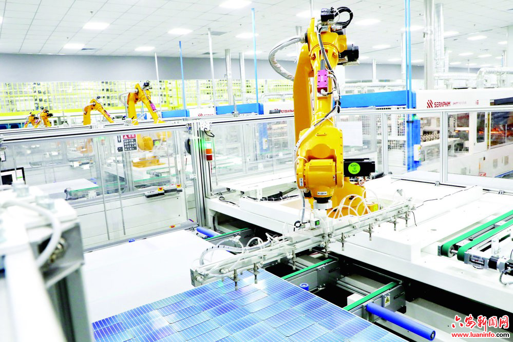 图为在位于金寨开发区境内的金寨赛拉弗能源科技有限公司生产车间,工业机器人高速运转赶制订单。
