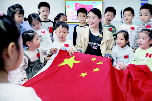 图为小朋友们在老师的带领下认识国旗、学习国旗知识,厚植爱国情怀。