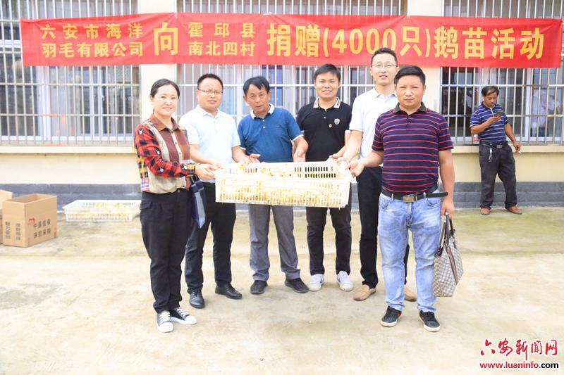 为助力贫困村年底打赢脱贫攻坚决战决胜和全面建成小康村收官之战,日前,由中国出口信用保险公司安徽分公司牵线搭桥,六安市海洋羽毛有限公司向霍邱县宋店乡重点贫困村之一的南北四村捐赠4000只鹅苗共同帮助该村打造“一村一品”皖西白鹅脱贫致富龙头产业,助力该村200个贫困、边缘贫困户和特殊困难户脱贫致富。