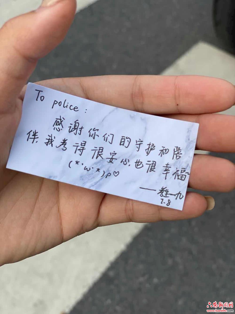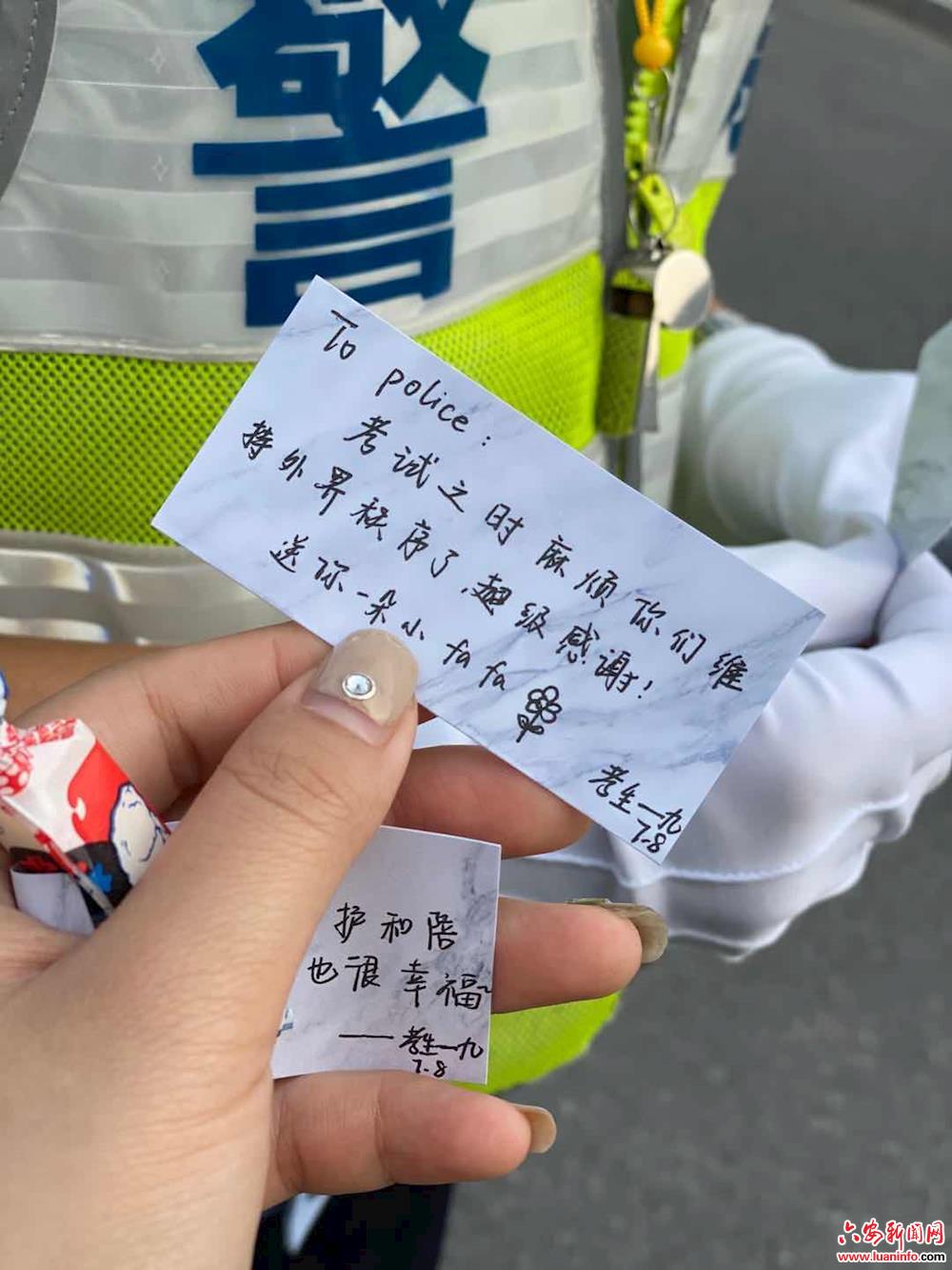 7月8日最后一场高考结束,市公安局交警支队一大队民警收到了一份特殊的礼物。在城区金安路实验学校考点,一群高考的学生来到了执勤交警身边,伸出了紧握的手,在手心有一张小小的字条和一枚很普通的糖果。字条上写着:“感谢你们的守护和陪伴,我考得很安心也很幸福”,“考试之时麻烦你们维持外界秩序了,超级感谢”,“你们都是护花使者,因为考试的孩子都是祖国的花朵”。一枚小小的普通糖果,让执勤民警甜在了心里。执勤民警说:“今天我们也很幸福”。( 傅文 )