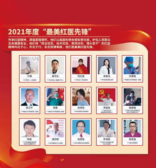 受广州市卫生健康委委托,广州市医师协会于2021年8月6日组织省、市专家召开了专家评审会。秉承公平、公正、公开、择优的原则,采取逐级推荐、资格审查、专家评议的方式,共选出“最美红医先锋”15名、“最美妙手仁医”15名、“最美抗疫战士”30名。