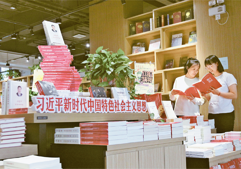 党确立习近平同志党中央的核心、全党的核心地位,确立习近平新时代中国特色社会主义思想的指导地位,反映了全党全军全国各族人民共同心愿,对新时代党和国家事业发展、对推进中华民族伟大复兴历史进程具有决定性意义。图为2021年10月4日,河南省焦作市博爱县新华书店里,读者在阅读习近平新时代中国特色社会主义思想相关书籍。 中新社发 程全/摄