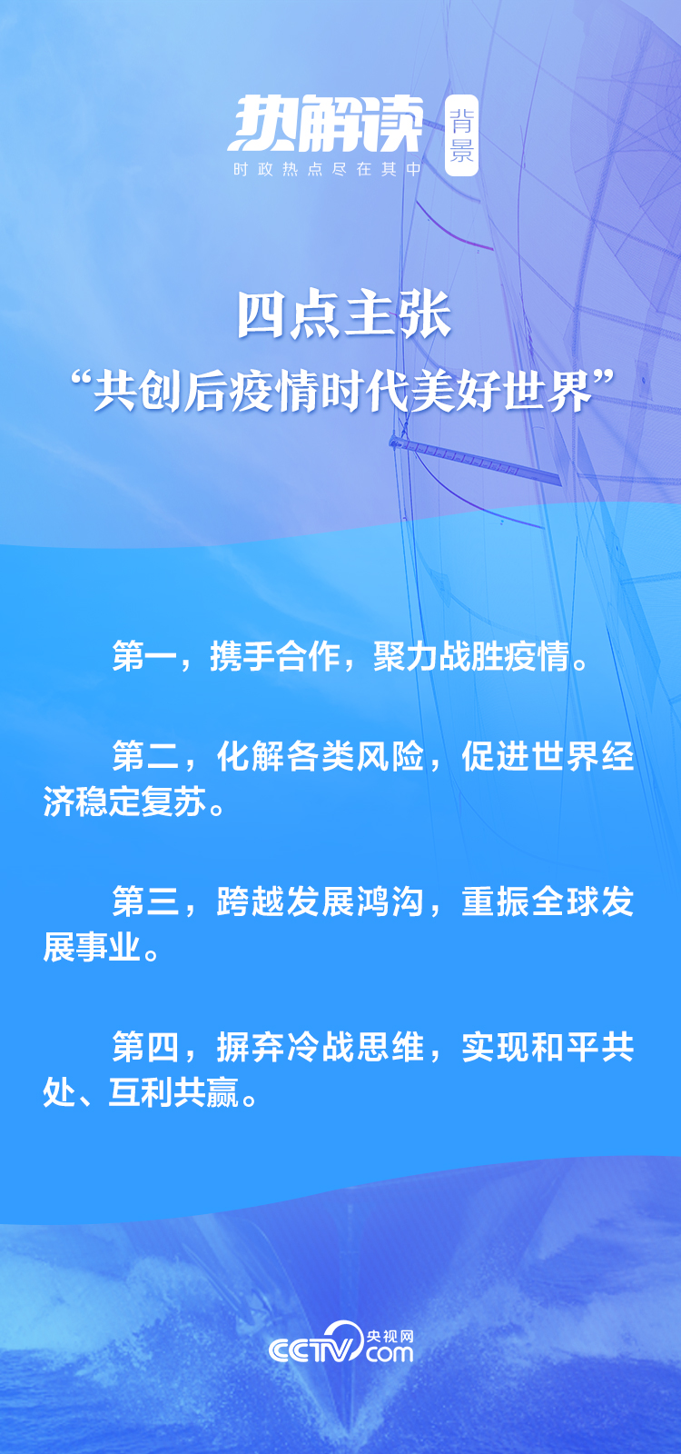 着眼人类前途命运,前瞻世界发展大势,直面问题挑战、把脉时代课题、提出中国方案,习近平主席以宏阔的国际视野和高度的责任担当,提出“四点主张”“三项承诺”,为共创后疫情时代美好世界指明了方向。