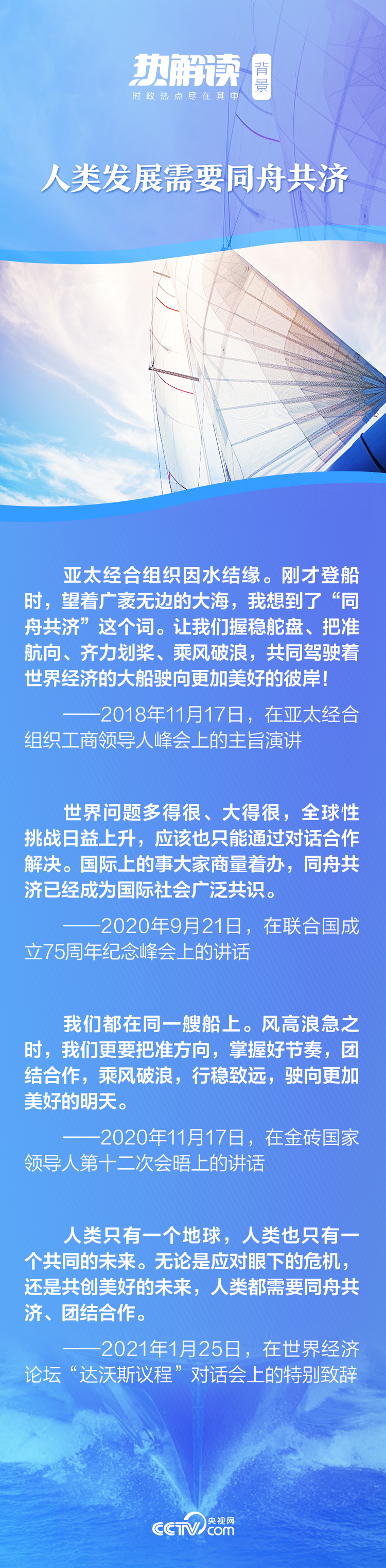 在演讲中,习近平主席再提“大船论”,他用“各国不是乘坐在190多条小船上,而是乘坐在一条命运与共的大船上”这一形象比喻揭示了人类命运休戚与共的现实。