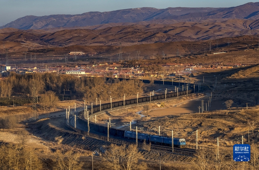 2021年12月23日,一列万吨煤炭列车行驶在内蒙古乌兰察布市卓资县境内。新华社发(纪恩泉 摄)