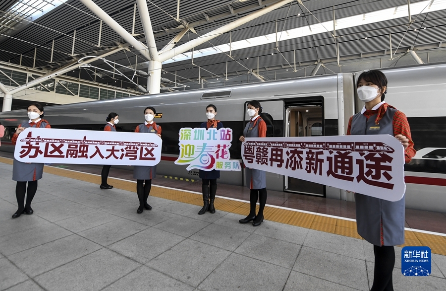 沐浴着虎年的阳光,开通不久的赣深高铁上,一列列火车飞驰而过。