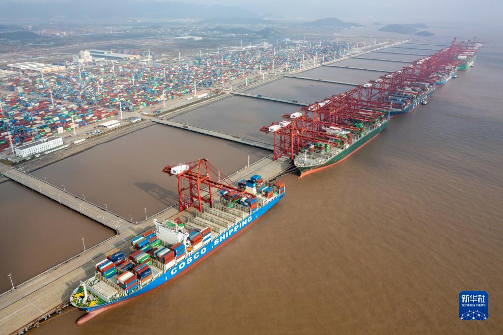 浙江宁波舟山港梅山港区集装箱码头一派繁忙景象(2021年12月17日摄,无人机照片)。新华社发(蒋晓东 摄)