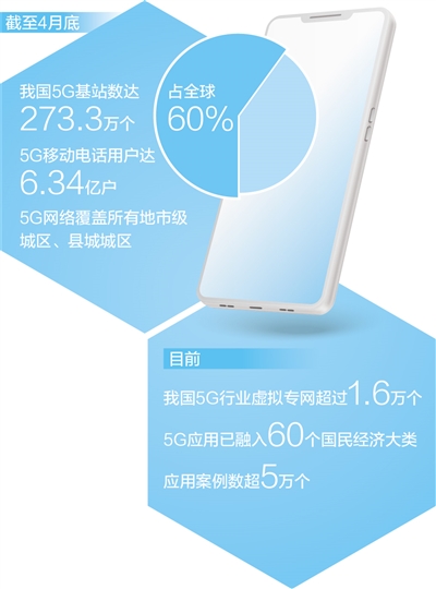 工业和信息化部统计显示,截至今年4月底,我国5G基站数达到273.3万个,占全球60%;5G移动电话用户达6.34亿户,5G网络覆盖所有地市级城区、县城城区。