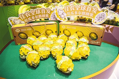在食品及农产品展区,佳农公司展台展出全球首发的厄瓜多尔麒麟果。