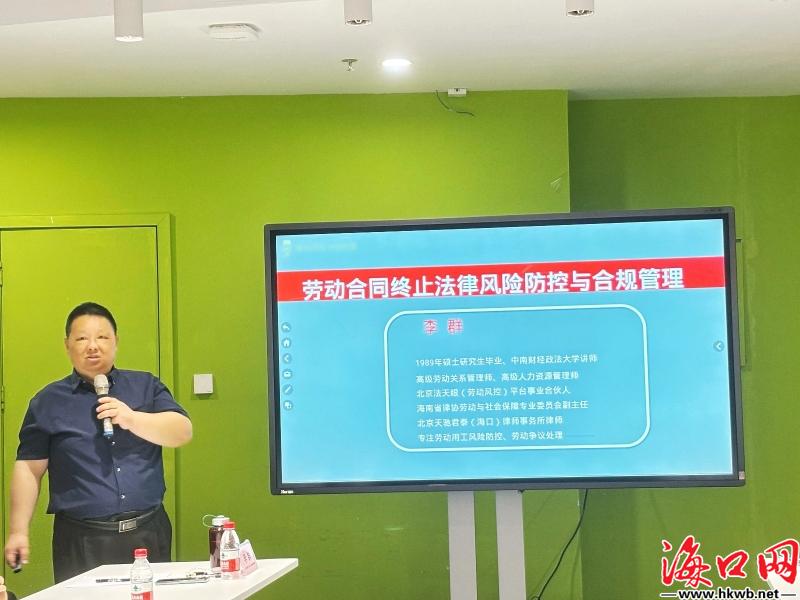海口网9月20日消息(记者吴怡辉)为进一步提高企业用工管理水平,增强劳动用工常见风险防范能力,切实保护好企业和职工双方的合法权益,构建和谐稳定的劳动用工关系,9月19日下午,由海南省劳动人事争议联合调解中心主办,海南省人力资源和社会保障学会、中国海南人力资源服务产业园海口分园、复兴城人才—就业服务站承办的“2024政策进园区 服务面对面系列活动(第四期)暨劳动争议微课堂——劳动关系变更、解除与终止的风险防控”专题知识讲座走进中国海南人力资源服务产业园海口分园。