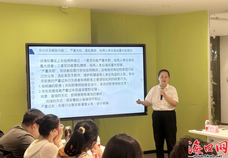 海南省劳动人事争议仲裁院仲裁员祁慧结合劳动法律法规,围绕调整工作岗位、劳动关系解除等常见问题进行主题分享。(活动方供图)