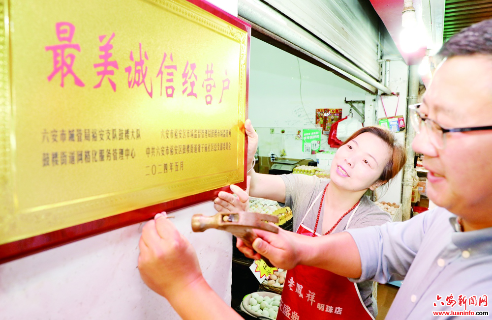 为加强文明诚信建设,引导社会公众和市场主体积极参与文明城市创建,提升“守法经营”“文明经营”“诚信经营”意识。5月15日上午,裕安区鼓楼街道锥子庙社区联合裕安区市场监管局鼓楼市场监管所为百花农贸市场吴乃梅等五位“最美诚信经营户”颁发奖牌并挂牌。