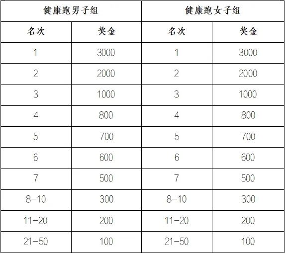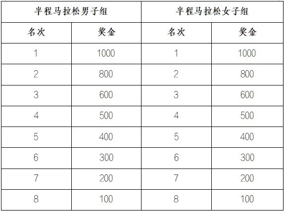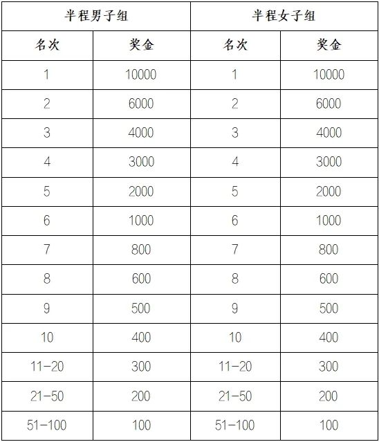 男/女前3名按枪声计时成绩录取,第4名开始按净计时有效成绩录取,并分别获得奖金如下。(人民币,单位:元)