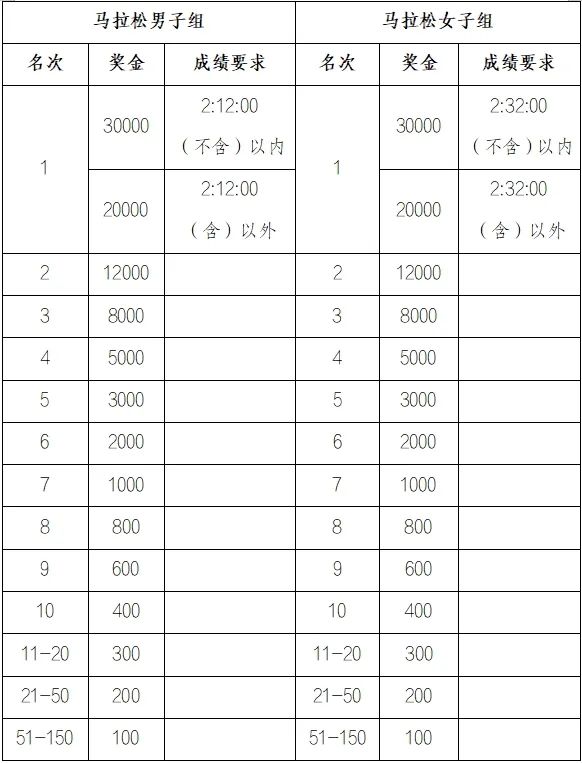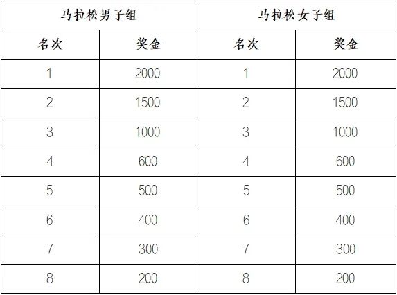 本次比赛组委会特设立六安籍马拉松项目市民奖,男、女分别录取前8名(按净计时成绩进行排名),分别获得奖金,见下表(单位:人民币/元)。