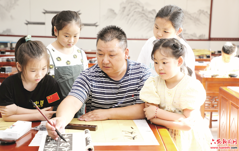 “同学们,你们看老师是怎么写撇和捺的”……8月3日16时,六安市皋城小学的智能化数字书法教室里,书法教师洪德遣正在手把手教学生如何运笔、习字。