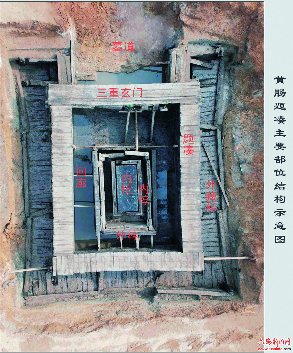 “黄肠题凑”是西汉特有的一种体现墓主人生前显赫社会地位的葬制。所谓“黄肠”,即去皮后黄心的柏木,“题凑”,枋木的端头全部朝着棺椁中央层层平铺、叠垒。而刘庆的墓所用木材均为大别山区的栎木,属于就地取材,没有使用黄心柏木,体现了皖西特色。