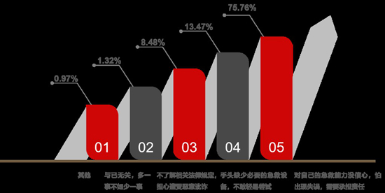 廉思课题组的报告显示,缺乏急救知识是大学生不愿参与现场急救的原因之一。当遇到呼吸停止的无意识人员时,68.33%的被调查者选择“拨打120,并在原地等候”,能“立即上前查看,并采取急救措施”的只有25.76%。