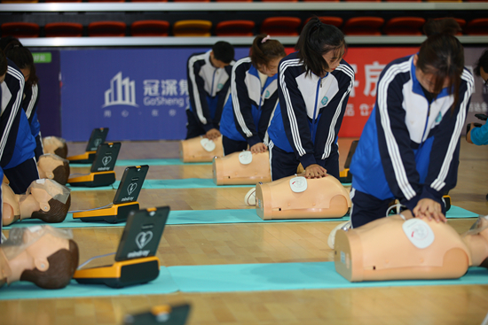 青年学生进行心肺复苏操作学习。陈政/摄