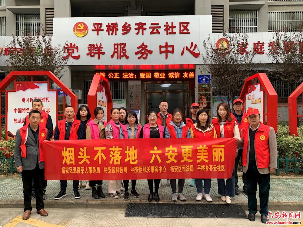 10月28日,裕安区平桥乡齐云社区组织区直包保单位志愿者及社区志愿服务队的队员们共同开展以“烟头不落地,城市更美丽”为主题的志愿服务活动,对社区周边居民小区、花坛、绿化带、巷道路面等死角死面进行集中清理。
