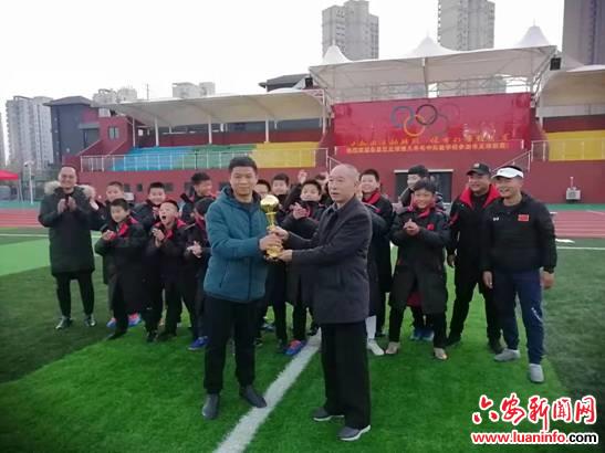 2020年11月30日下午17时,六安一中东校区操场上空响起激昂的运动员进行曲,2020年六安市中学生校园足球联赛高中组别冠军队颁奖仪式正在举行。当市教育局领导将高中男子组冠军奖杯和一等奖奖牌授予裕安区代表队时,全场响起了热烈的掌声,孩子们兴奋的跳将起来,把奖杯紧紧搂在怀里……