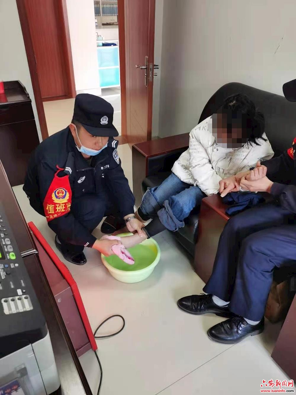在派出所,女孩手脚冰凉且情绪激动,所长周百军亲自脱下女孩的鞋袜后把自己的棉鞋给女孩穿上,值班民警为其洗脚并拿来电暖霸给小女孩取暖。