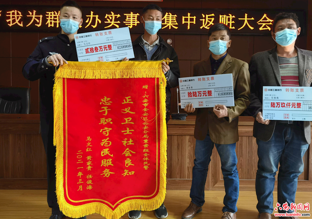 为进一步提升辖区居民的安全感和满意度,向社会各界展现警方对侵财犯罪的打击成效,维护群众切身利益的坚定决心。3月26日上午,市公安局金安分局举行“我为群众办实事”集中返赃大会,共向18名受害人返还涉案赃款,涉案价值达109万余元。