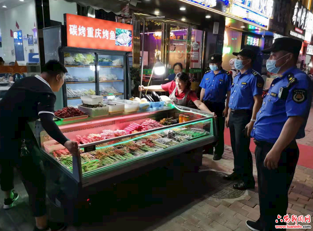 裕安区城管局城南大队对凯旋名门夜市摊点群进一步规范,依法取缔响洪甸路、磨子潭路流动摊点15户和嵩寮岩路“某某味道”露天烧烤店,加强凯旋名门小区东门沿线出店经营管理,制定方案,开展常态化错时值班巡查。