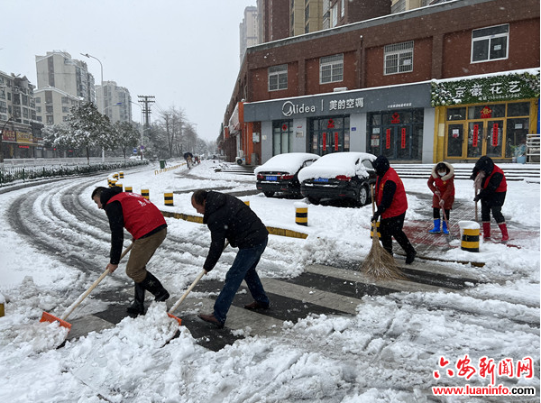 2月6日晚间,六安迎来首场大雪,一片银装素裹,白雪皑皑,带来美丽雪景的同时,也给道路交通、群众生活出行带来诸多不便。为深入贯彻“以人民为中心的发展思想”,最大力度降低冰雪对群众出行的影响,三里桥街道连夜启动应急预案,全员上岗,铲雪除冰,排查安全隐患,保障群众出行和生产安全。