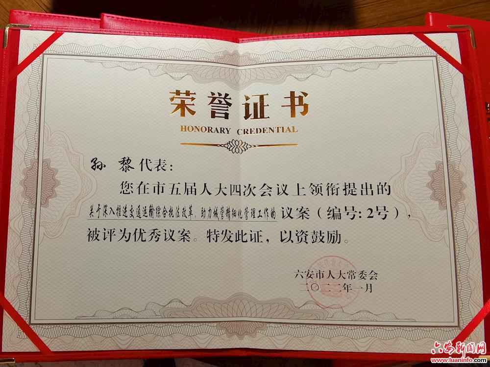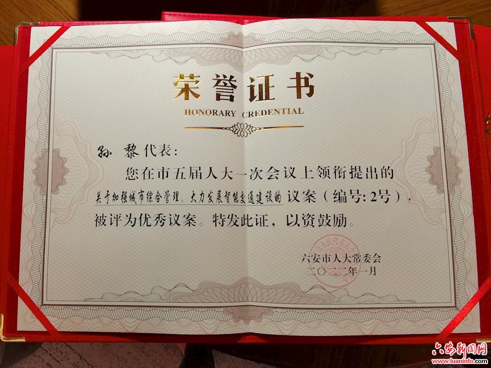 日前,正在参加市“两会”的人大代表孙黎收到了7份来自六安市人大常委会颁发的荣誉证书,其中优秀议案3项,优秀建议4项。