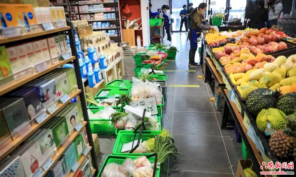 企业仓储商品调送有序,超市门店货源保障无忧。在六安百源幸运星超市有限公司大唐美林湾店,超市员工正根据客户在线上下单情况将商品分别整理收集在购物篮里,一户一单一篮,然后装袋送至附近客户所在小区门口。作为裕安区防疫期间生活必需品保供点,为做好附近住户生活必需品保障,十几名工作人员分工协作,共同做好接单、装袋、配运等工作。