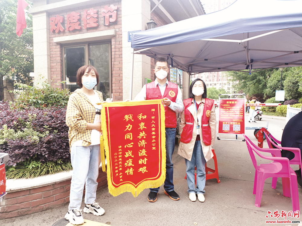 4月27日,金安区清水河街道刘园社区负责人将一面“和衷共济渡时艰 戮力同心战疫情”的鲜红锦旗送到了市人大办志愿者疫情防控值班点位,表达对市人大常委会机关下沉一线战疫情的感谢。5月5日,一面写着“众志成城同抗疫 心系鼓楼显担当”的锦旗由裕安区鼓楼街道负责同志送到市人大常委会机关,表达对市人大常委会机关支持疫情防控工作的感谢之情。