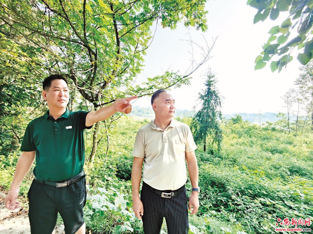 图为汤永云(右一)与村党支部书记杨明武查看荒滩。