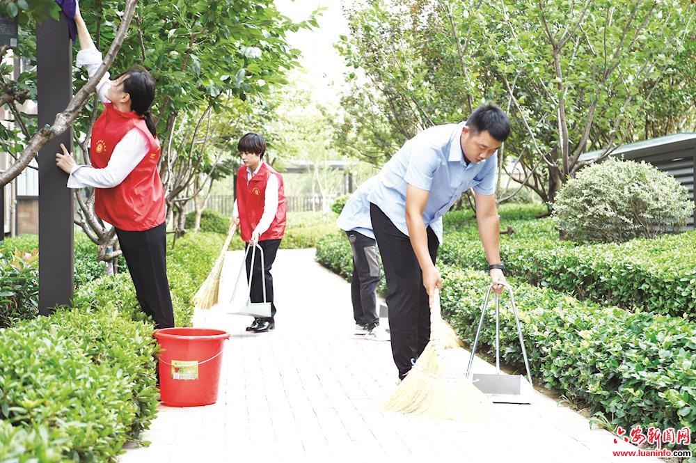 9月23日下午,裕安区新安镇清溪社区和中建二局的志愿者们正在辖区的小区进行卫生清洁,共同为文明创建贡献力量。