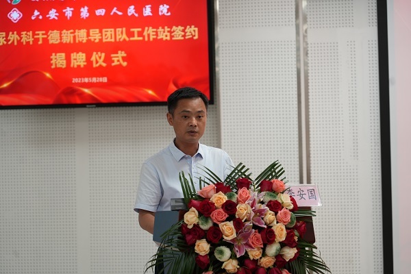 六安市第四人民医院党委书记李安国在致辞中指出,近年来,医院始终坚持以人民健康为中心,持续加强学科建设,提高服务管理水平,泌尿外科作为医院重点特色科室,坚持以提升技术水平为主线,聚焦打造学科、技术、人才、科研“四大高地”,于德新博导团队工作站落户我院,为医院乃至全区高层次泌尿外科人才培养提质增效带来了良好机遇,我院将紧抓此次难得的合作契机,坚持以人民为中心的发展思想、精准对接医学发展需求,从提升内涵出发全方位做好工作站的服务保障工作,努力将泌尿外科建成临床、教学和科研齐并发展的重点学科,推动我院泌尿外科疾病综合诊疗能力再上新台阶。