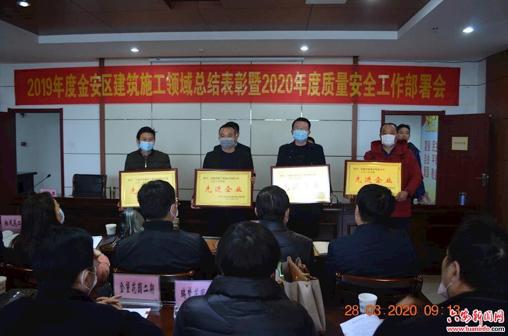 会议宣读了2019年度建筑行业优秀企业和先进个人的决定,通报批评了两家较差企业,并对相关先进企业、先进项目部现场授牌,对先进个人予以表彰奖励。相关建设单位、施工项目部和监理企业先进项目在会上交流工作经验,宣传和项目好的做法;金安区住建局代表分别与安徽华野、安徽圣红、十七冶三家企业代表签订安全生产目标责任状。