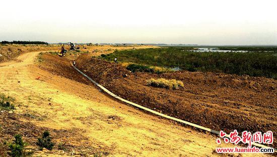5月20日,霍邱县沿岗河防洪治理三期工程砼护坡格埂施工现场,挖掘机马达轰鸣、分段开挖格埂基槽,工人们或忙于立模、或紧张浇筑混凝土,9.40km的堤防上一派繁忙景象。