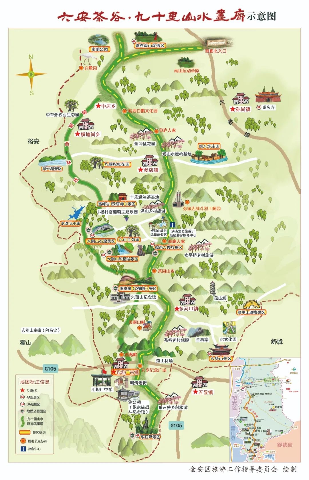 九十里山水画廊位于金安区南部,全长约90华里,跨越中店乡等5个乡镇。有4个4A级景区,3个3A级景区、3个大别山国家地质公园,一个国家级历史名镇和诸多景点镶嵌其中。中店乡悠然南山作为画廊的起点,景区内生态环境优良、旅游资源丰富。