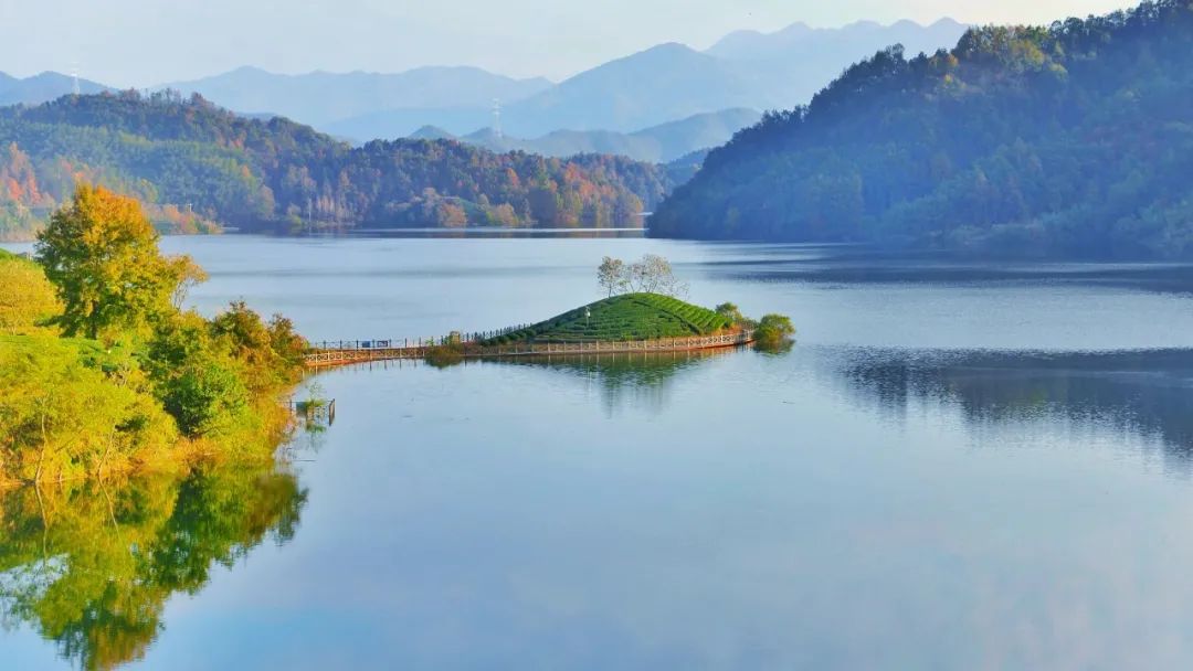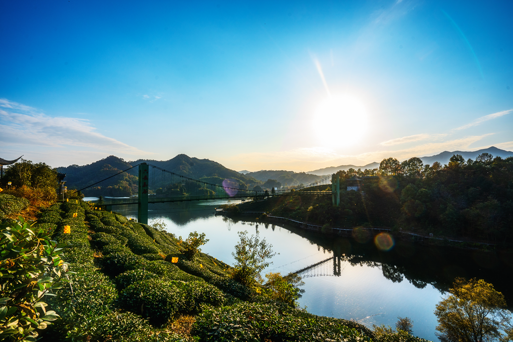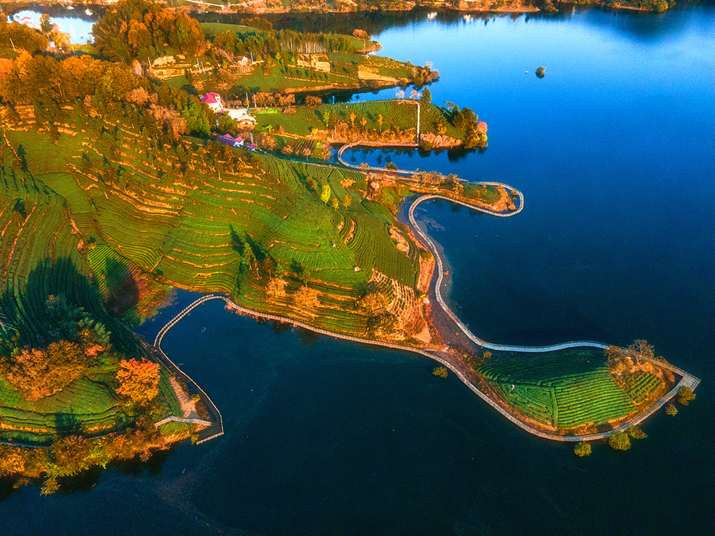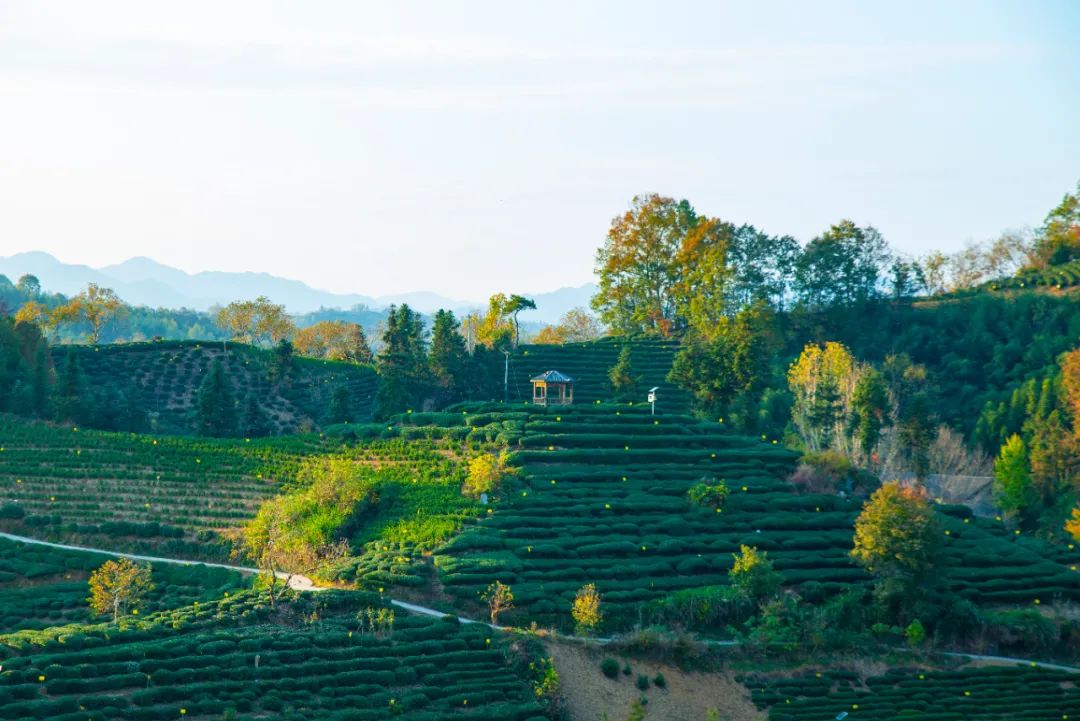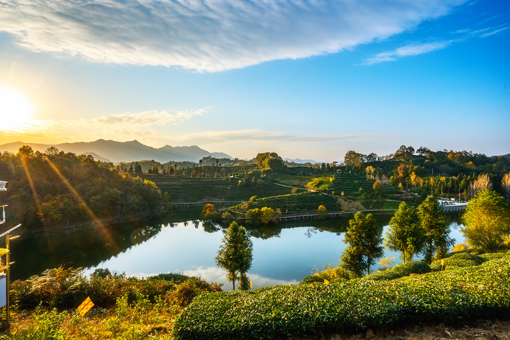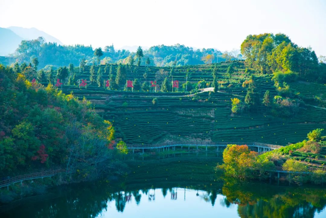六安西茶谷主题公园,位于大别山腹地的金寨县油坊店乡面冲村,是六安瓜片原产地的一角。园内自然风光旖旎,水天一色,纵使已入冬季,茶谷中依旧绿意未尽,茶园葱翠,远山如黛,比春日里更多了一份静谧的美。走进谷内,无边的秋色让游客沉醉。