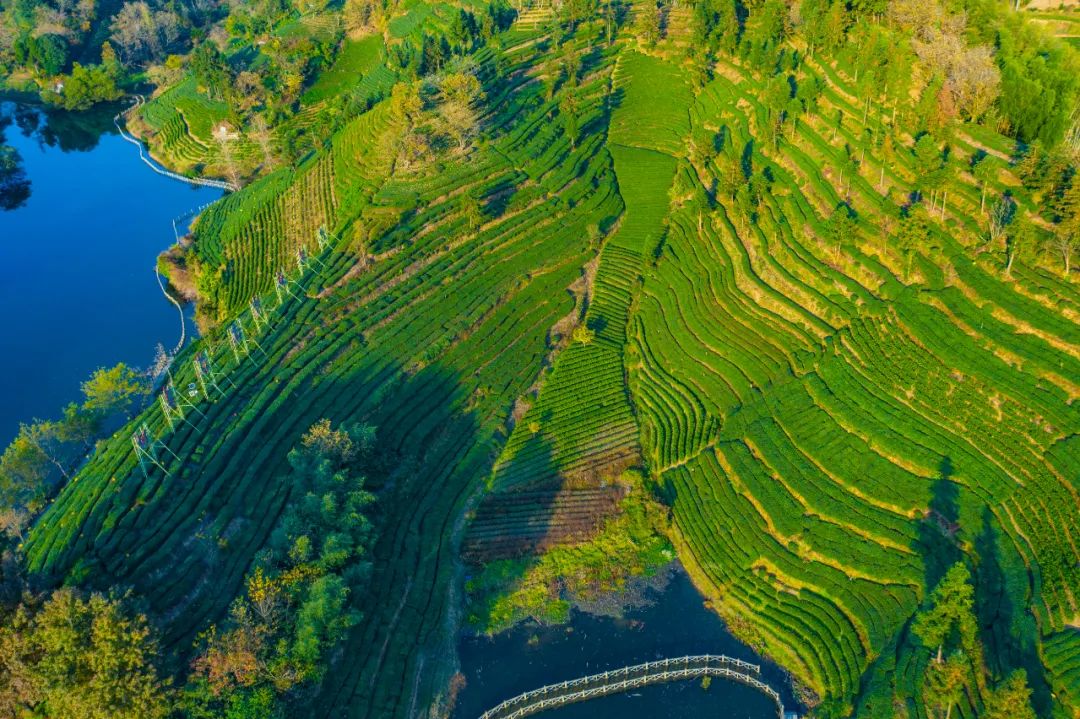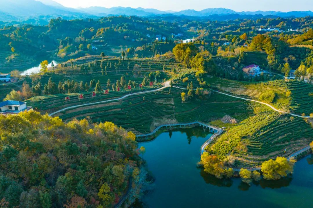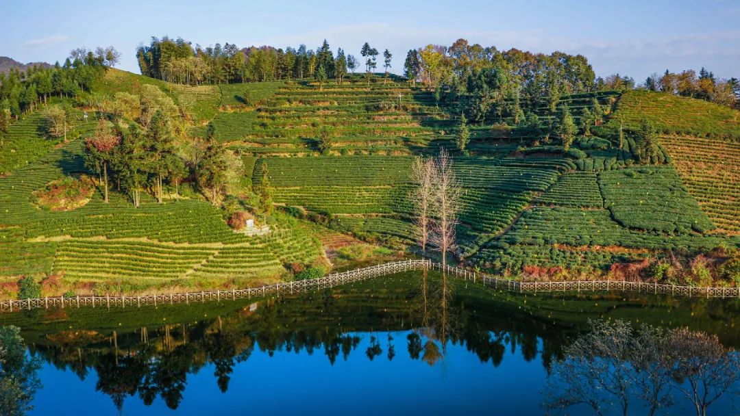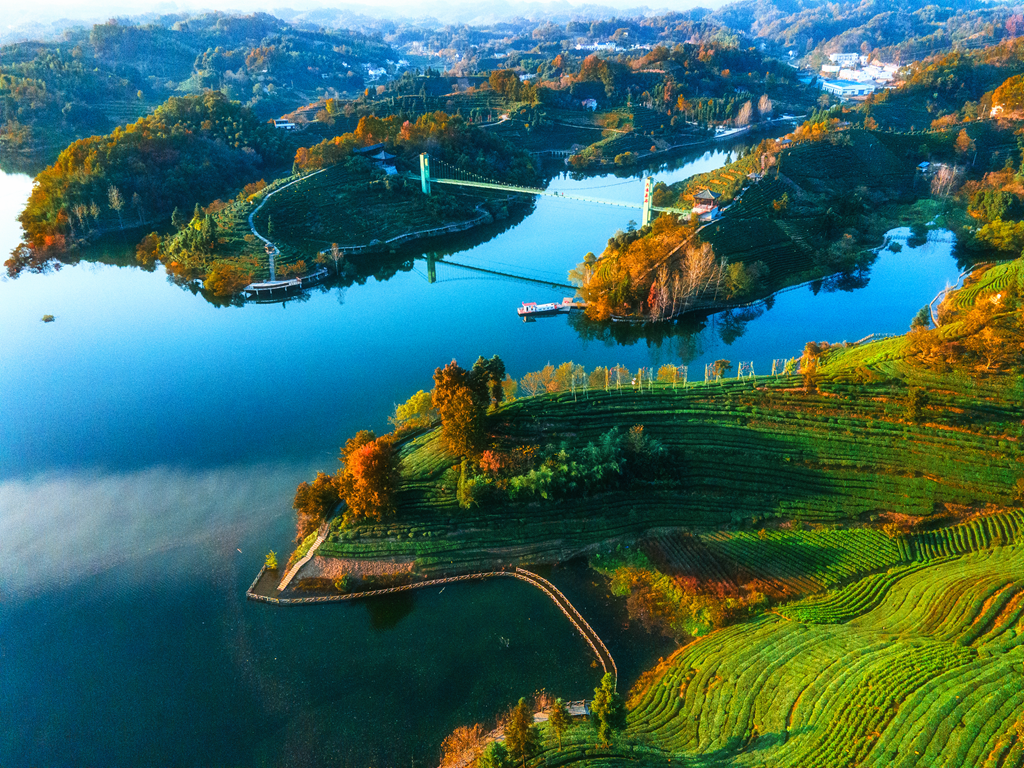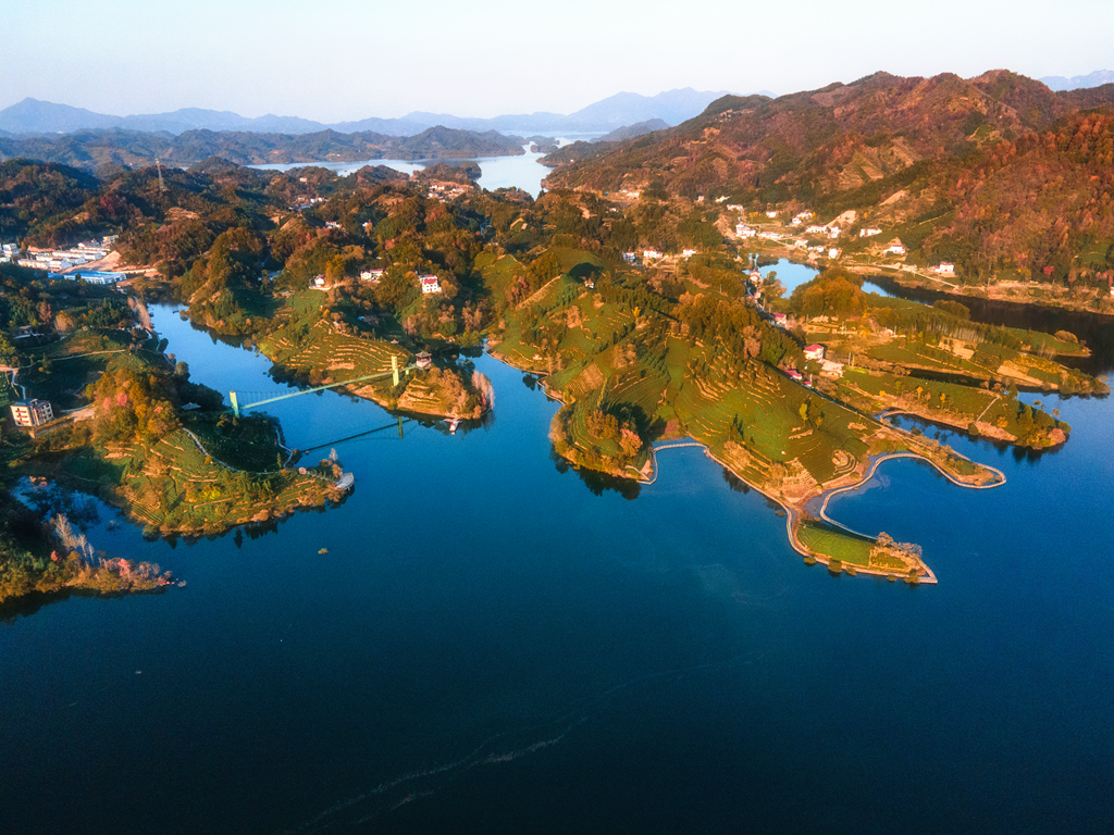 六安西茶谷主题公园,位于大别山腹地的金寨县油坊店乡面冲村,是六安瓜片原产地的一角。园内自然风光旖旎,水天一色,纵使已入冬季,茶谷中依旧绿意未尽,茶园葱翠,远山如黛,比春日里更多了一份静谧的美。走进谷内,无边的秋色让游客沉醉。