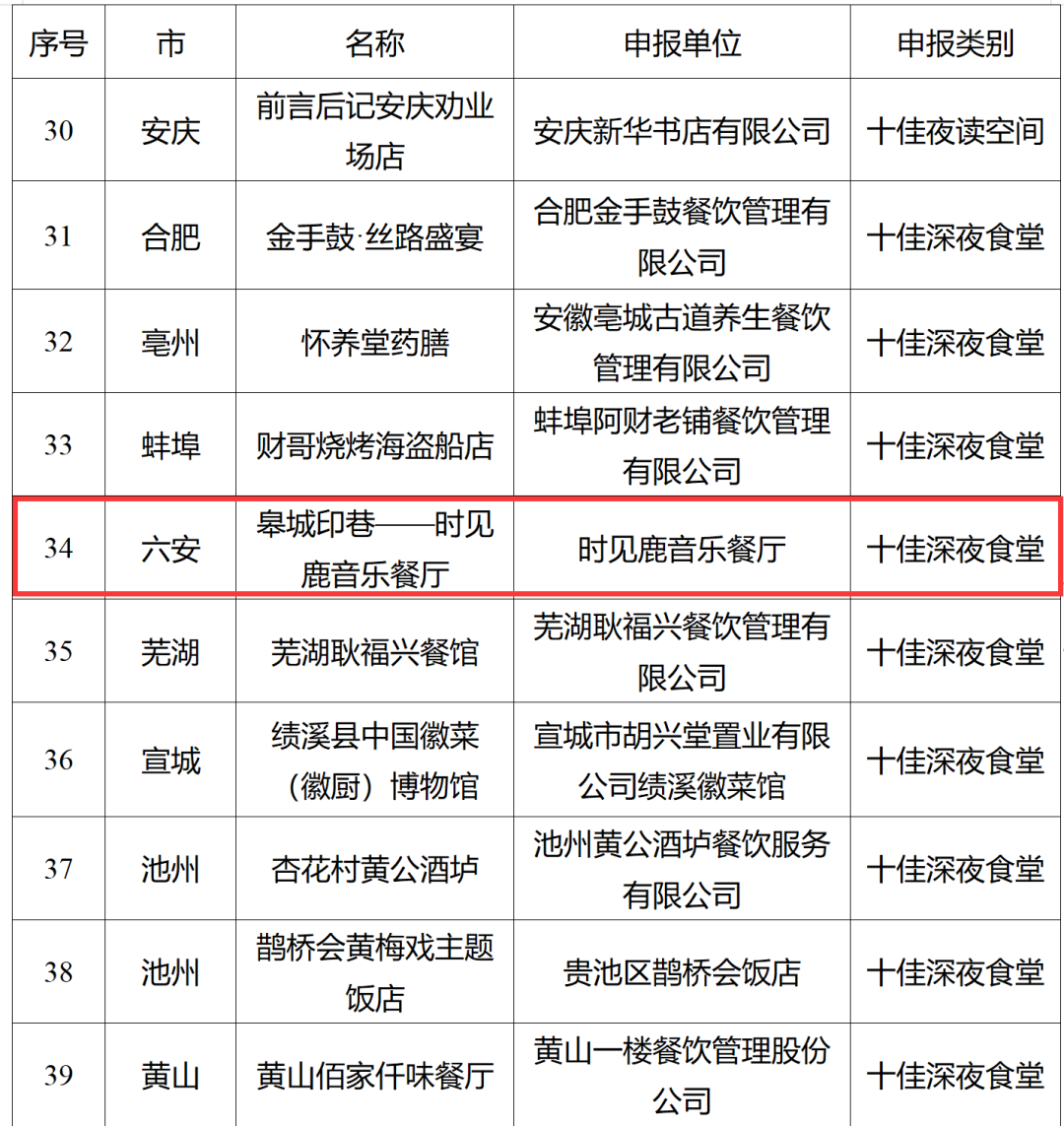 近日,省文化和旅游厅公布了2022年度安徽省夜间文旅消费“四个十佳”品牌入选名单,裕安区皋城印巷——时见鹿音乐餐厅入选全省“十佳深夜食堂”。